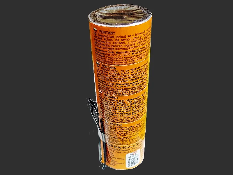Musi być sprzedawane w opakowaniu. Tylko do stosowania na wolnym powietrzu. Minimalna bezpieczna odległość: 8m. Widzowie powinni znajdować się w odległości co najmniej 8m. Położyć pojedynczo na ziemi. Stojąc z boku, zapalić system inicjujący na jego końcu i oddalić się natychmiast na odległość co najmniej 8m. Zakaz sprzedaży osobom poniżej 18-go roku życia! Stosować na niepalnej powierzchni!