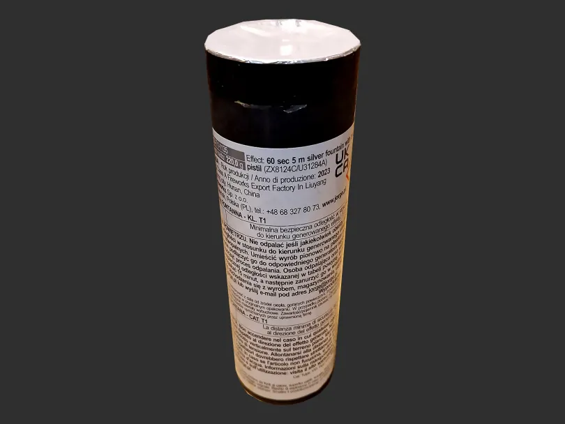 Fontanna sceniczna srebrna/niebieska o wysokości 5 metrów i czasie działania 60s. Odpalana wyłącznie za pomocą systemu lub baterii 9V. Produkt przeznaczony do użytku zewnętrznego.