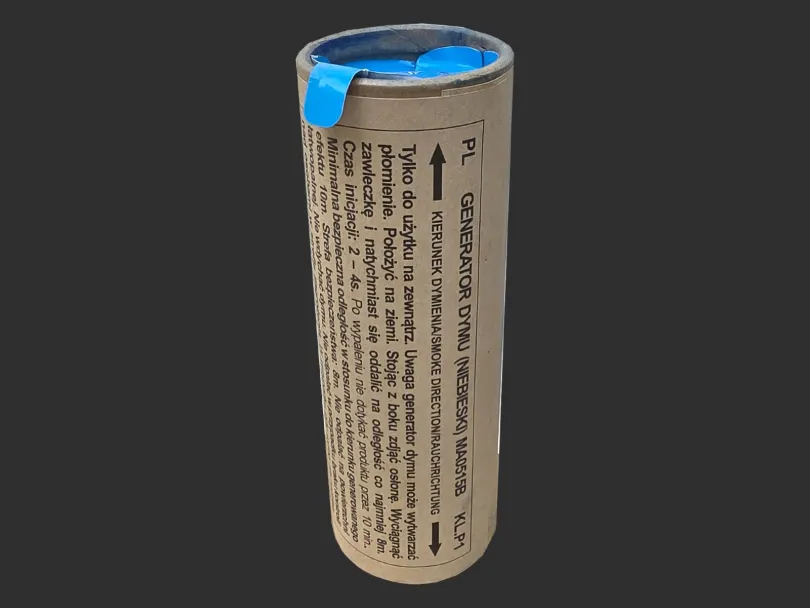 Dwustronny generator dymu o intensywnym niebieskim zadymieniu. Bardzo dobra jakość i duże zadymienie. Idealne do ASG i na Paintball lub dowolne imprezy plenerowe. Produkt odpalany za pośrednictwem pociągnięcia zawleczki. Czas działania: ok. 60 sek