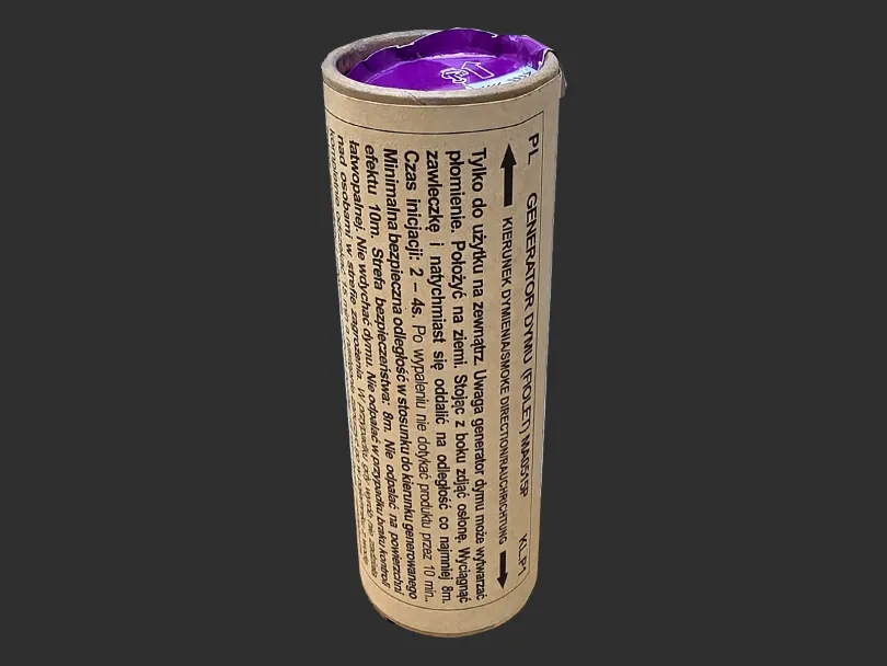 Dwustronny generator dymu o intensywnym filotetowym/purpurowym zadymieniu. Bardzo dobra jakość i duże zadymienie. Idealne do ASG i na Paintball lub dowolne imprezy plenerowe. Produkt odpalany za pośrednictwem pociągnięcia zawleczki. Czas działania: ok. 60 sek