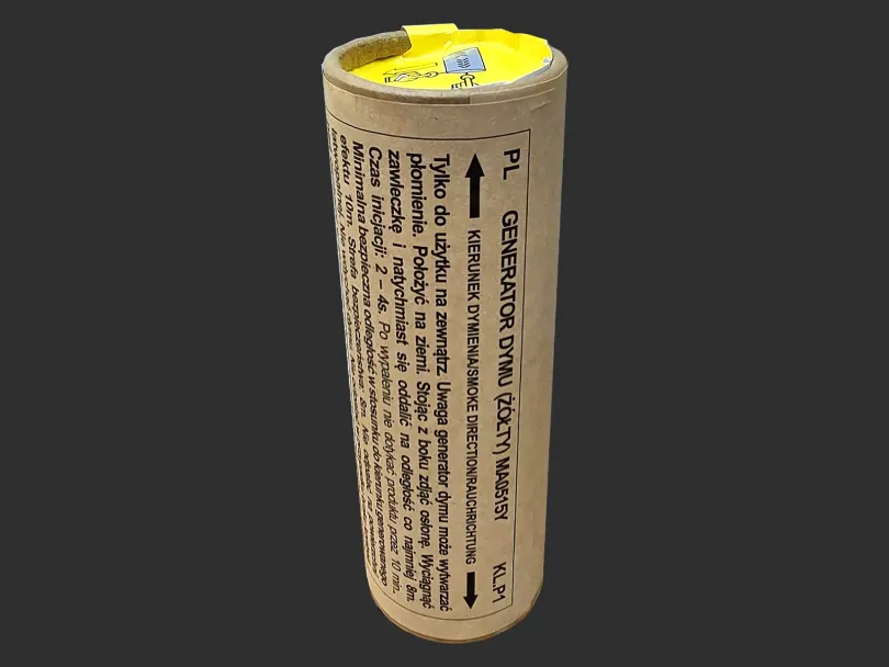 Dwustronny generator dymu o intensywnym żółtym zadymieniu. Bardzo dobra jakość i duże zadymienie. Idealne do ASG i na Paintball lub dowolne imprezy plenerowe. Produkt odpalany za pośrednictwem pociągnięcia zawleczki. Czas działania: ok. 60 sek