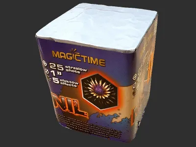 Wyrzutnia 25 strzałów. Kaliber 25mm Czerwona dalie z białym migotaniem, pomarańczowo-zielone perły i biały brokat, zielona perła chryzantemą, brokatowe korony z cracklingiem, brokatowe korony ze srebrną chryzantemą.