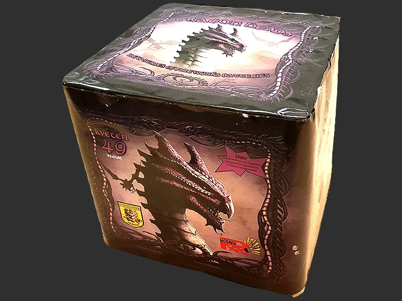 Kolekcja Smoków od Czeskiego importera Pyro Moravia. 49 strzałów Kaliber 30mm Brokatowe korony z niebieskimi kulkami, purpurowe peonie z tytanowymi chrysantemami.