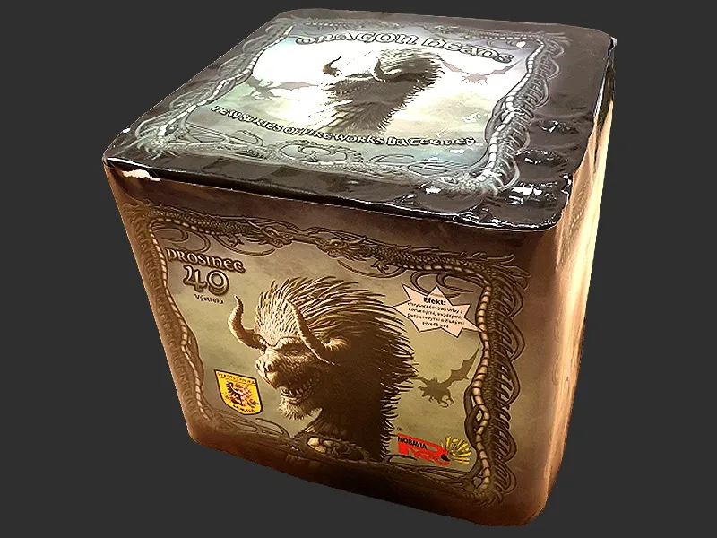 Kolekcja Smoków od Czeskiego importera Pyro Moravia. 49 strzałów Kaliber 30mm Chrysantemy i palmy z czerwonymi, niebieskimi, purpurowymi i żółtymi peoniami.
