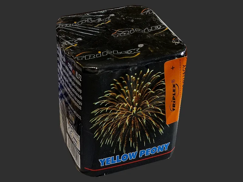 Bateria 9 strzałów 20mm o efekcie żółtej peoni. Mała bateria wymaga ustabilizowania przed odpaleniem np poprzez obłożenie ciężkimi przedmiotami (cegły, kamienie)