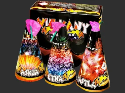 Zestaw 3 wulkanów. Czas działania 20s. Srebrne iskry z 1-zielonymi, 2-srebrnymi i 3-złotymi perełkami