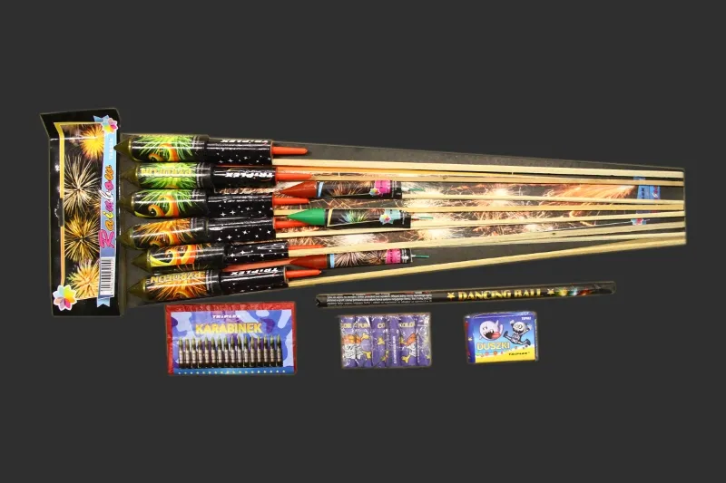 Zestaw zawiera: 9 rakiet, 1 op. pchełek, 1 op. bączków, 1 petarda błyskowa, 1 rzymski ogień