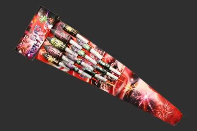 Duży zestaw składający się z 12 rakiet. 5 o długości 85 cm, 4 o długości 65 cm oraz 3 o długości 50 cm. Do zestawu dołączona rurka ułatwiająca bezpieczne odpalanie produktu.