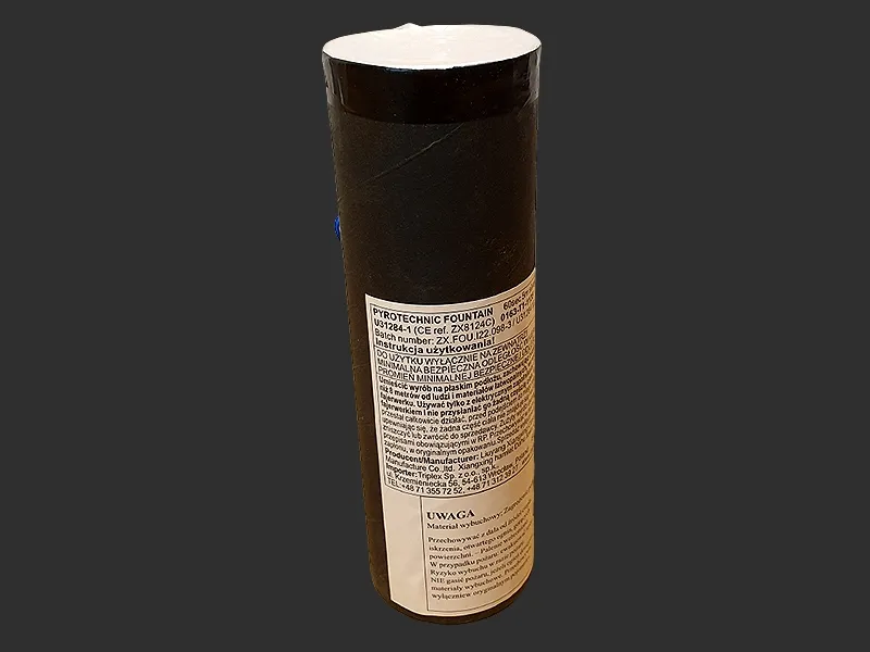 Fontanna sceniczna srebrna/niebieska o wysokości 5 metrów i czasie działania 60s. Odpalana wyłącznie za pomocą systemu lub baterii 9V. Produkt przeznaczony do użytku zewnętrznego.